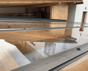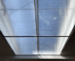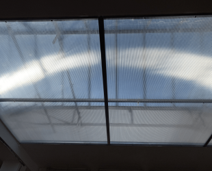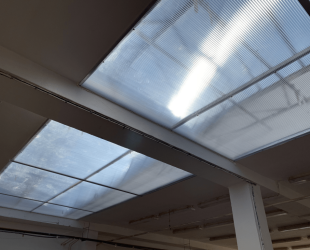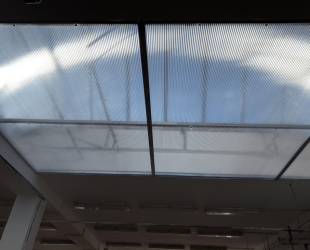 Uzavretie podhľadu pod svetlíkom v priemyslených priestoroch. Použitý materiál dutinkový číry LEXANTM THERMOCLEARTM v hrúbke 10mm